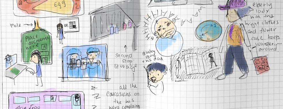 We trudged out of the booths and left our spit in a large box, where we entered an exam room. The reception was poor so watching videos was out of the question, so instead, I sat at my desk working on the Pigeon Hole Illustration logo while slowly turning into a walking popsicle. I stayed in my seat most of the time, observing the others in the room, eventually, I fell asleep on my backpack. Sleeping helped to pass time, kept me warm and from going hungry. (They provided sandwiches, but I didn't feel like eating anything) However, this never lasted. I kept getting poked into consciousness, doing my best to comprehend what the worker was saying to me, I ultimately failed to do so; I ended up reading off the papers they shoved me anyways. The wait was finally over, in 7 short hours :) Or so I thought. Rushing out the freezer, we were herded into a corner and left to roast, waiting to be picked up. Many of us watched jealously when a man rode up on a huge tour bus to pick up his daughter. Surrounding her in a cloud of disinfectant, before driving away in their 40 seater vehicle. It was a jarring sight, to say the least, though it gave this other girl (who sat behind me on the plane) and I something to bond over.
